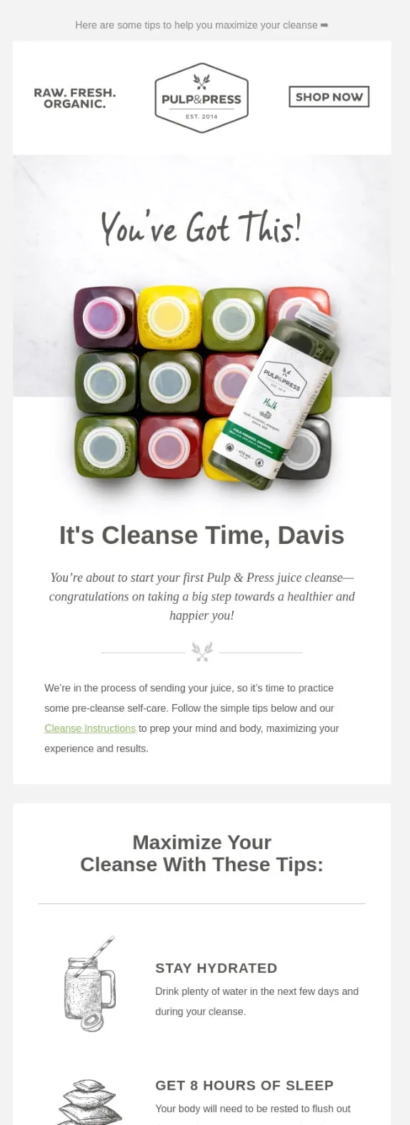 La marca utiliza correos electrónicos de confirmación para informar a los clientes de que han recibido su pedido y les da consejos para prepararles a sacar el máximo partido del producto. Este tipo de educación personalizada puede aumentar la satisfacción y retención del cliente. También posiciona a Pulp & Press como un recurso atento y útil.