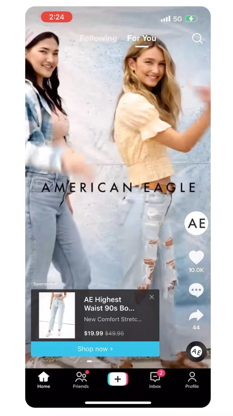American Eagle es una marca que ya está aprovechando el poder del comercio social en TikTok. Las publicaciones en las que se puede comprar, como esta, destacan productos específicos y convierten el conocimiento de la marca en compras: